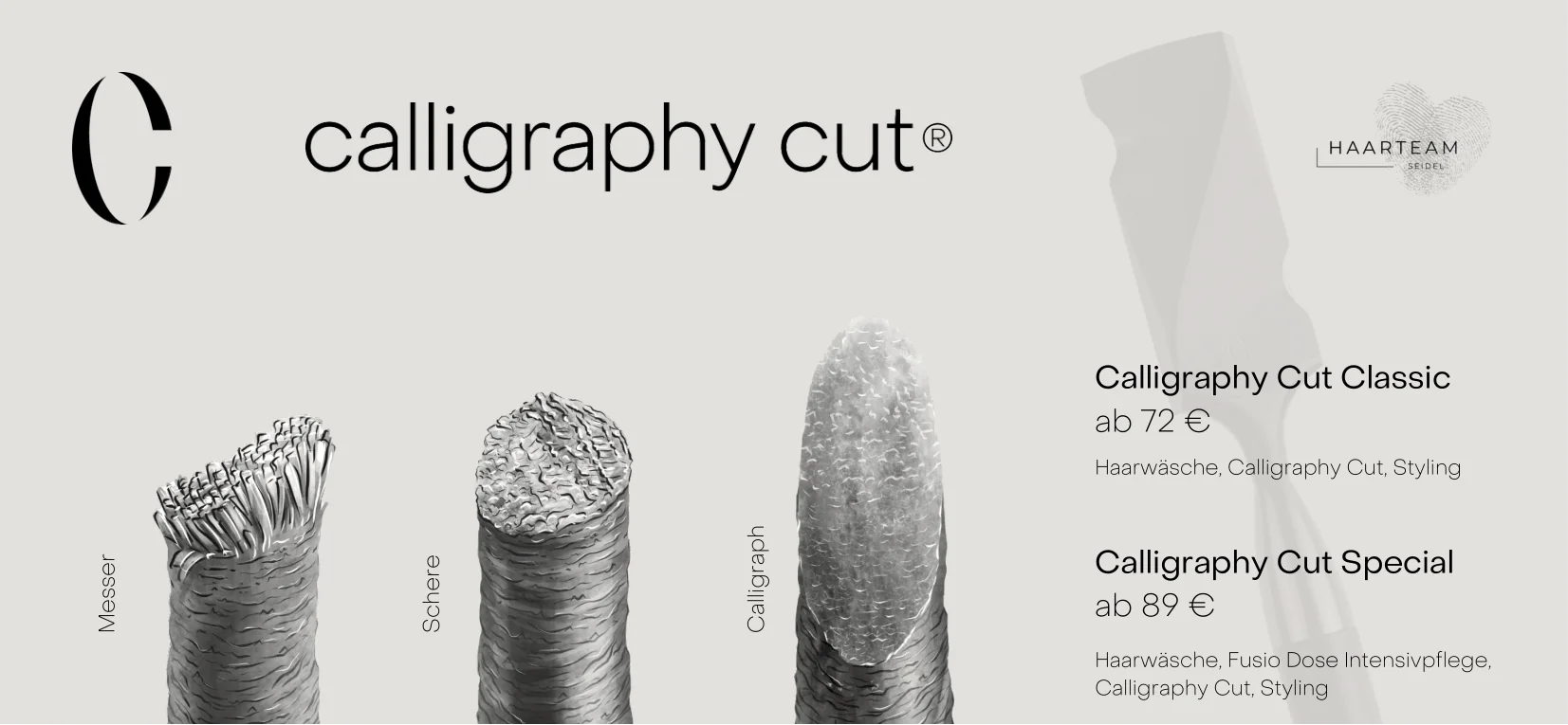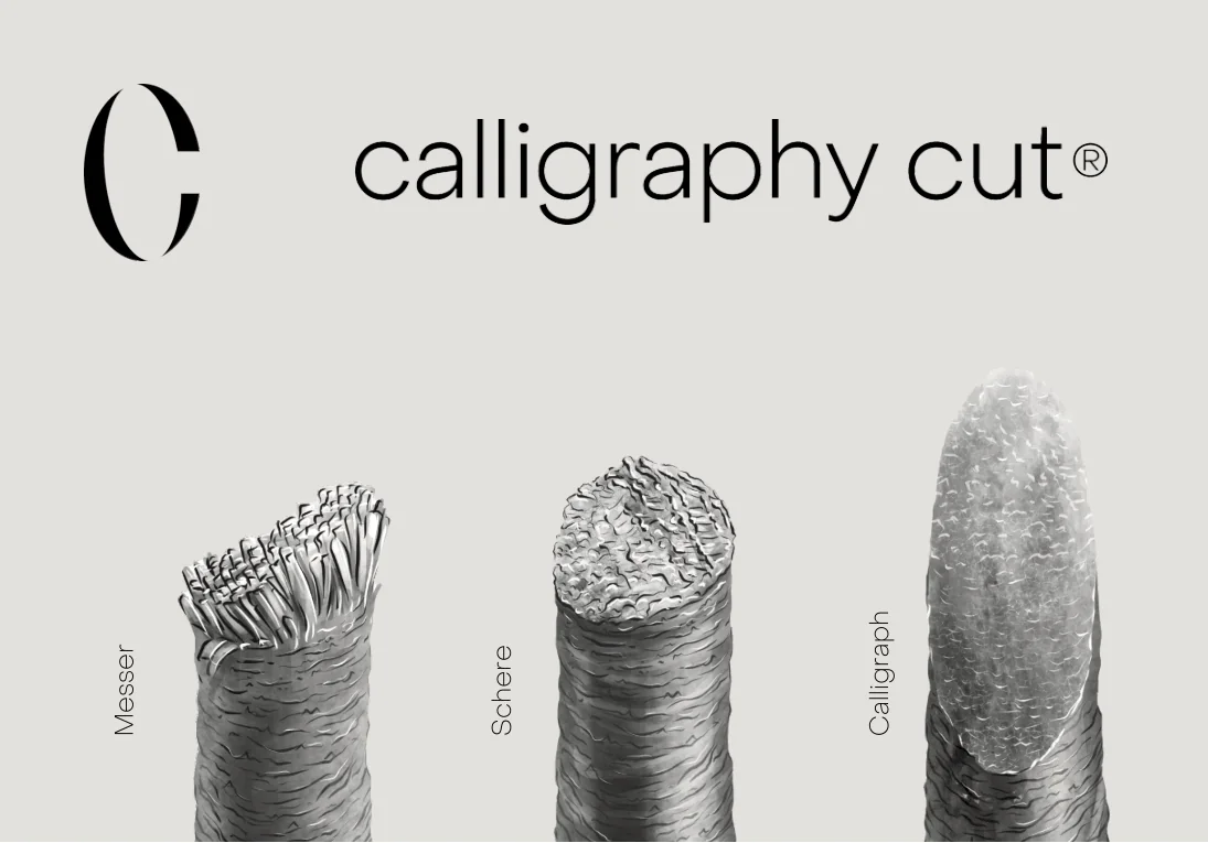 Der Calligraphy Cut ist die innovative Haarschnitt-Technik, die Ihr Haar zum Strahlen bringt! Dank des einzigartigen Schneidewerkzeugs, das dem Haar eine perfekte diagonale Linie verleiht, wird das Haar mit mehr Volumen und Sprungkraft versehen. Der Calligraphy Cut ist nicht nur schonend für das Haar, sondern verbessert auch dessen Struktur, was zu einem glänzenden und gesunden Aussehen führt.